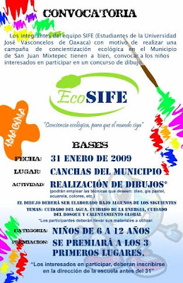ü Eco-SIFE busca involucrar al mayor número de personas en sus actividades de concientización social, es importante que hombres y mujeres sin importar edades, ni estratos sociales, nos involucremos en los cambios, pero es de vital importancia la concientización temprana de las futuras generaciones, los niños. Es por esta razón que se convocó a niños de 6 a 12 años a un concurso de dibujo coordinado por Ivonne Taboada con el objetivo de que los niños participantes plasmaran en dibujos su percepción acerca de la importancia del cuidado del medio ambiente, la contaminación y el calentamiento global.